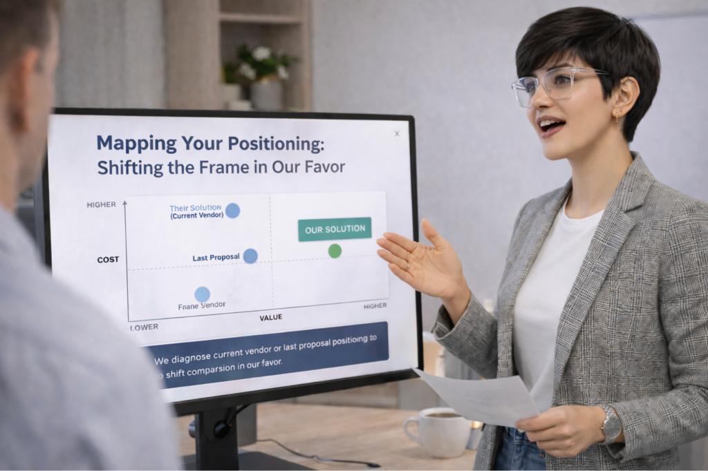 Application: Buyers evaluate positioning relative to a reference point, usually their current vendor or the last proposal they reviewed — not from a neutral baseline. The Diagnose phase maps these reference points through the Perceptual Map so we design positioning that shifts the comparison frame in your favour.